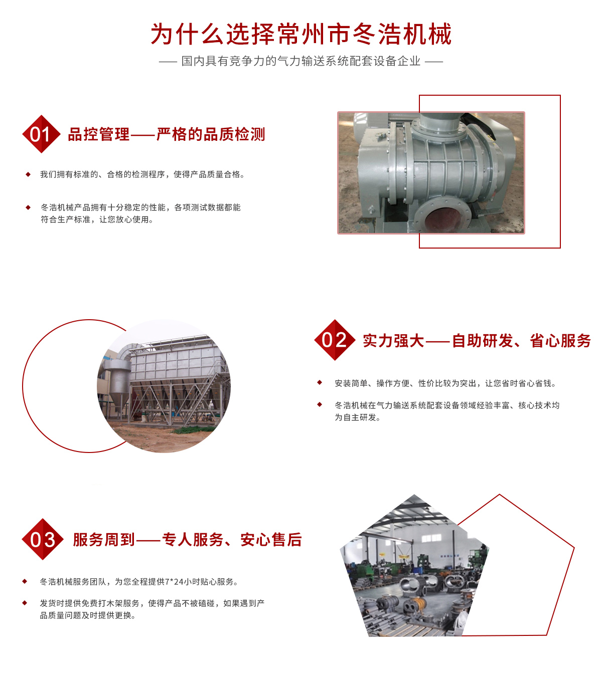常州市冬浩機(jī)械有限公司占地面積5000平方米,擁有一支專業(yè)的科技研發(fā)團(tuán)隊和配備專業(yè)的生產(chǎn)設(shè)備。專業(yè)致力于氣力輸送系統(tǒng)配套設(shè)備的研發(fā)、生產(chǎn)及銷售。產(chǎn)品在實際應(yīng)用中不斷創(chuàng)新、不斷升級,現(xiàn)已對接實現(xiàn)自動化、智能化、人性化。實踐證明公司生產(chǎn)的吸糧機(jī)系列、高溫羅茨風(fēng)機(jī)系列、關(guān)風(fēng)機(jī)系列、氣力輸送設(shè)備系列、特殊工況訂制系列的產(chǎn)品被廣泛運(yùn)用于石油化工、油脂、化工干燥、除塵、冶金、環(huán)保、電子、煤炭、建筑、電力機(jī)械、糧食、飼料等行業(yè)。為解決輸送、搬運(yùn)等環(huán)節(jié)中節(jié)約大量的人力、財力;從而提高了生產(chǎn)效率。